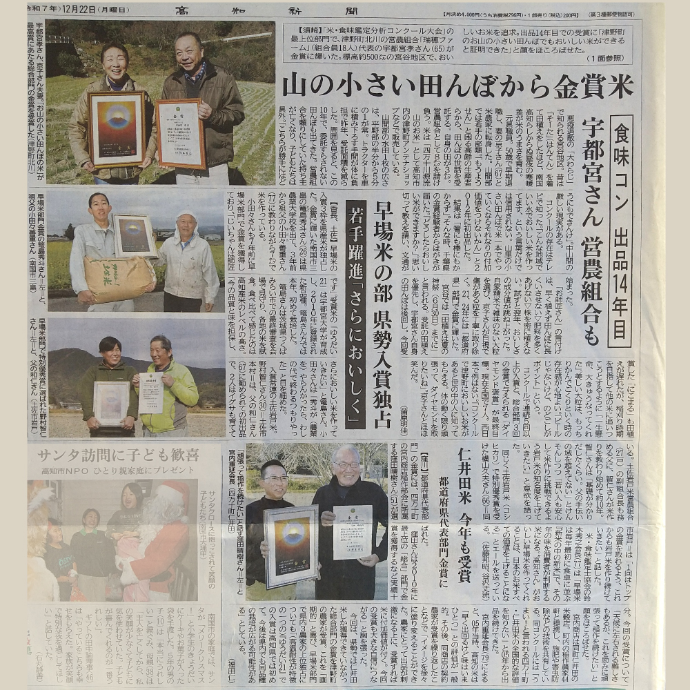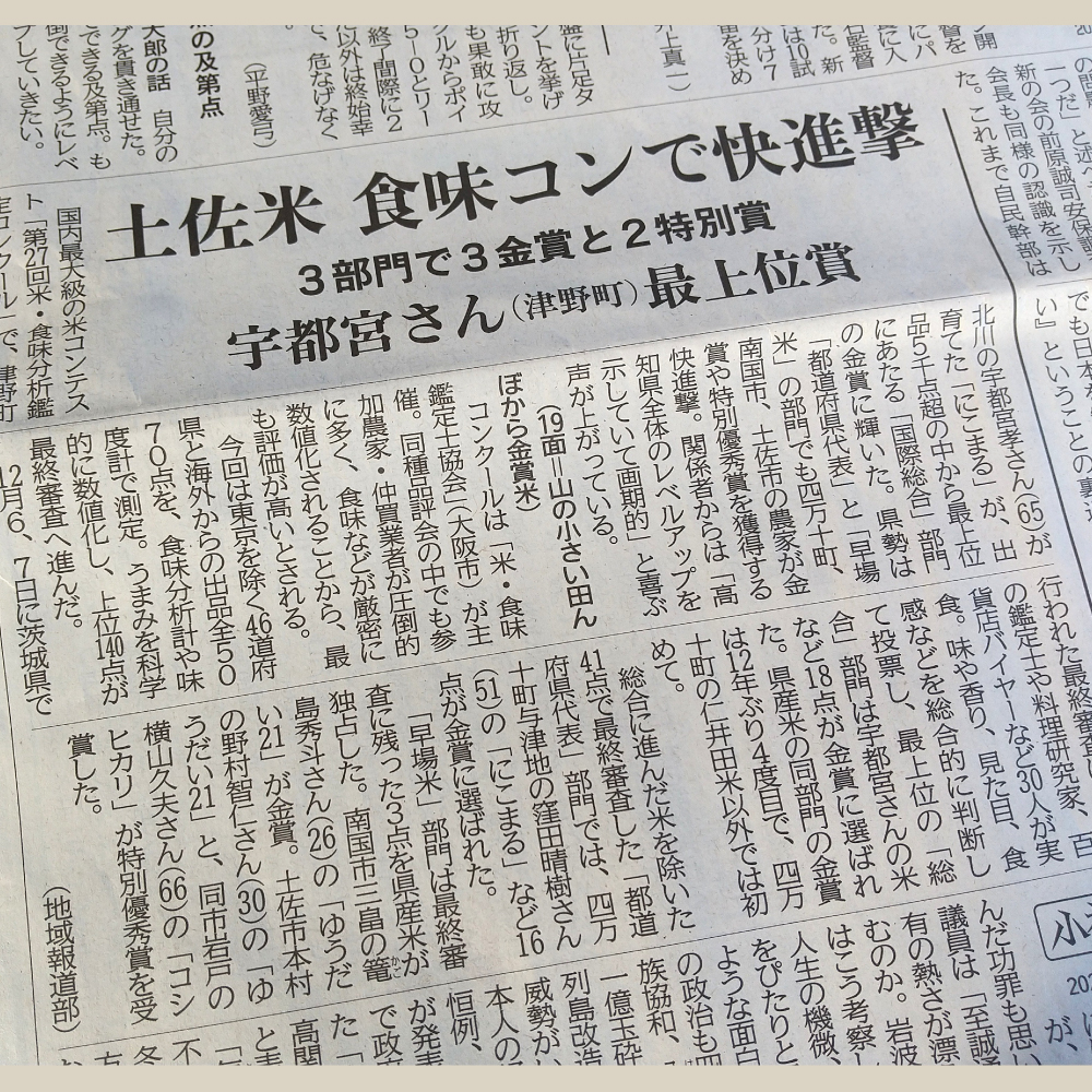 本日の高知新聞朝刊で「第27回米・食味鑑定分析コンクール」の結果について取材頂きました。