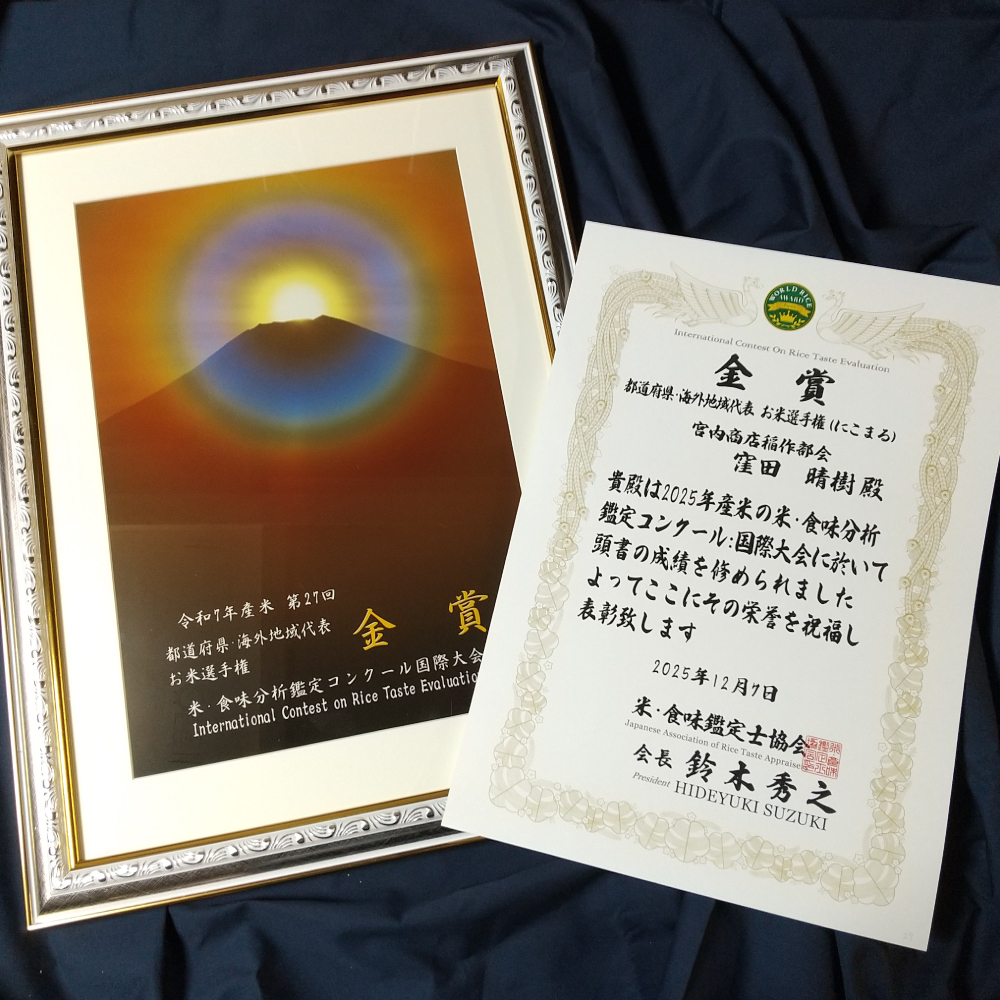 宮内商店稲作部会員の窪田晴樹さんの“にこまる”が同コンクールの「都道府県代表部門」に選ばれ、